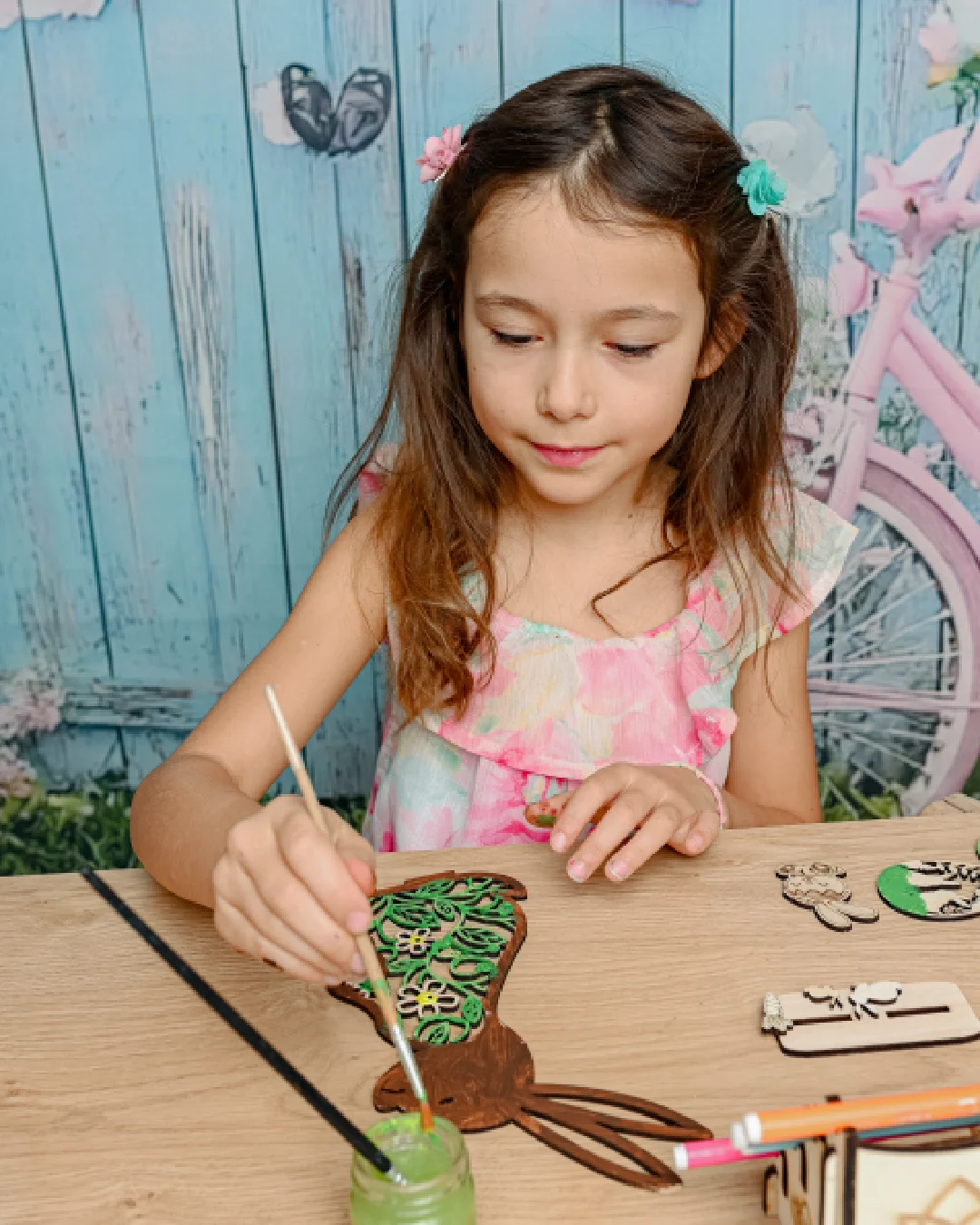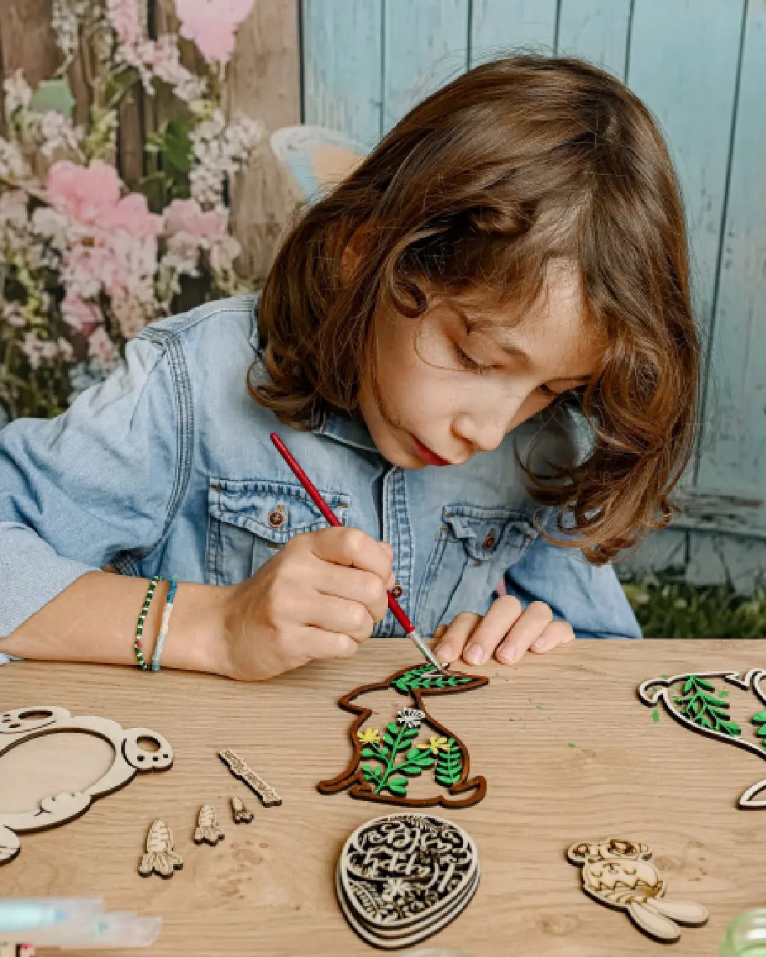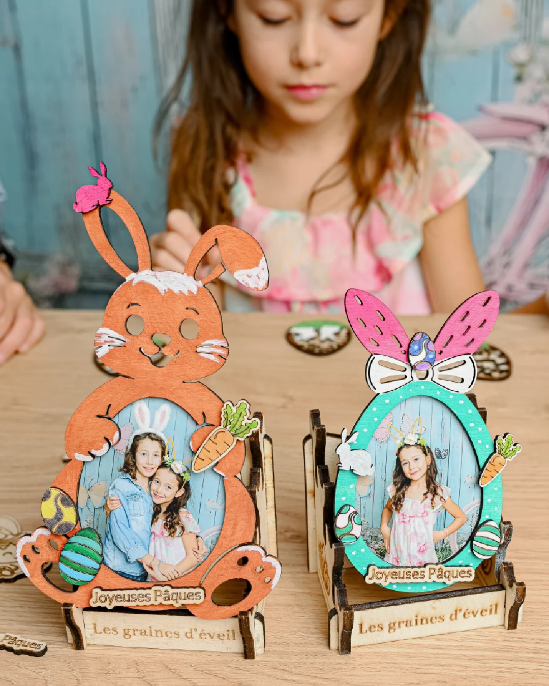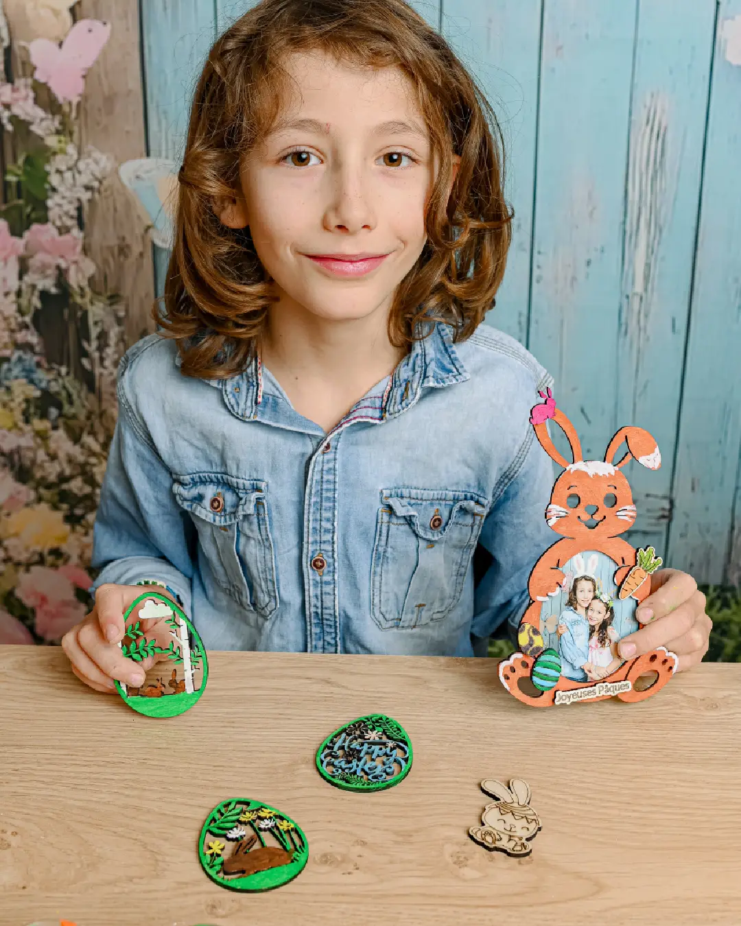 Un atelier de création en bois sur le thème de Pâques où les enfants fabriquent des lapins, des oeufs et des paniers en bois.